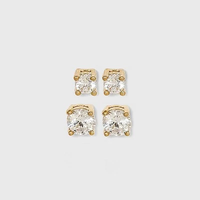 Look effortlessly stylish with the 14K Gold Plated Cubic Zirconia Duo Stud Earrings from A New Dayâ„¢. These charming earrings are made out of 14k gold-plated, nickel-free metal for comfortable and stylish wear. The clear-colored cubic zirconia stones match with everything in your closet, and help add a charming shine and sparkle to your favorite outfits. The post closure helps keep them in place as you go about your day.
