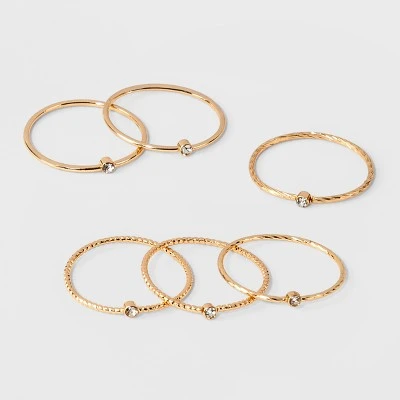 Adorn your fingers with this Clear Stone Ring Set from A New Day™ anytime your outfit needs a little something extra. These gold rings are dainty, elegant and understated with thin, smooth or textured bands and minuscule stones that add just the right amount of sparkle. Be bold and wear all six rings on one finger or wear a single ring for just a hint of bling.