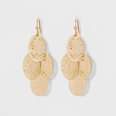 Bring old-world style to your earring collection with the Filigree Chandelier Earrings from A New Day. The chandelier-style filigree coin earrings help you make a statement. Pair them with gold bangles for a fun twist to your everyday jewelry choices. If you’re not satisfied with any Target Owned Brand item, return it within one year with a receipt for an exchange or a refund.