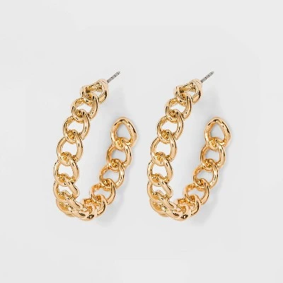 Accessorize your look with these Gold Frozen Chain Hoop Earrings from A New Day™. These round hoop earrings in a shiny gold tone finish make a versatile accessory for any occasion. They feature a classic inter-linked chain design for beautiful texture and style. The lightweight earrings are comfortable for all-day wear — they have butterfly backs for a secure fit, while the nickel free metal construction suits most skin types. Wear this pretty pair with black dresses and heels or with everyday casual looks for a boost of fashion.