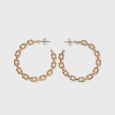 Add a chic vibe to any outfit with these Gold Linked Hoop Earrings from A New Day™. These round hoop earrings make a perfect accessory for any occasion. They feature an interlinked chain design in a gleaming gold tone to add edgy texture and a dose of extra shine to your everyday looks. These lightweight hoop earrings come with post-back closures for secure, easy and comfortable wear, and are made from nickel-free metal to suit most skin types. Wear them with a wrap dress and heels for a night out or wear with a simple jeans and tee combo for a chic finishing touch to your casual ensemble.
