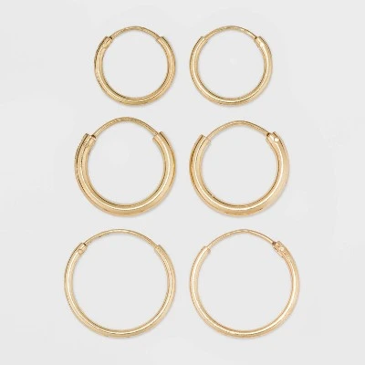 You can never go wrong with the Gold Over Sterling Silver Endless Hoop Fine Jewelry Earrings from A New Dayâ„¢. This earring set includes three pairs of hoop earrings in slightly different sizes, so you’ll have just the right accent for any occasion. Made of sterling silver with gold plating to add a touch of shine to your looks, the hoop earrings are easy to pair with a variety of outfits from workwear to casualwear.