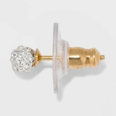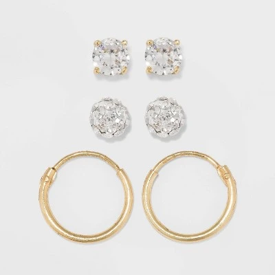 Create the perfect look every time with the Gold Over Sterling Silver Earring Set from A New Dayâ„¢. This earring set includes three different pairs – one pair of clear cubic zirconia studs, one pair of spherical studs covered with round cubic zirconia stones and one pair of gold-finished small hoop earrings with huggie closure – letting you easily change up your look. Pair the cubic zirconia studs with a fit-and-flare dress and pumps for date night, and add the huggie hoops to a tee and jeans to meet up with your friends for an afternoon at the movies.