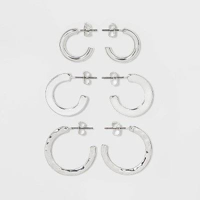 Jazz up your look with these Silver Hammered Metal Hoop Earrings from A New Day™. This set of silver-tone hoop earrings adds shine and offers easy styling with any outfit. It includes three metal hoop earring in varying sizes and in different smooth, hammered and flat finishes to add chic extra variety to your jewelry collection. These lightweight earrings are comfortable for all-day wear — they have butterfly backs for a secure fit, while the nickel free metal construction suits most skin types. Wear this pair with black dresses and heels or with everyday tee and jeans combo for a stylish boost.