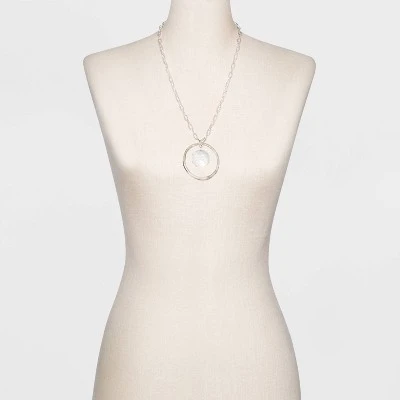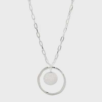 Sparkle any outfit easily with this Hammered Ring and Disc Pendant Necklace from A New Dayâ„¢. This silver-tone necklace features a long-linked chain that falls downward to the top of the bust to create a dramatic look. The chain comes complete with a pendant showcasing a disc held inside a hammered ring for artisanal flair. Whether you’re getting ready for a special event or just accessorizing a fun look to meet up with friends, this matinee-length necklace will complement your outfits in cool style.