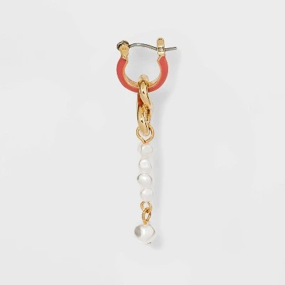 The Huggie Hoop Earrings from A New Day™ are the perfect way to add color, texture and movement to your look. This pair of gold-finish earrings features a small hoop silhouette in an enameled finish to hug your ear with a hint of color, along with dangling details with different lengths on each — a number 8 charm in gold tone with multiple pearlized white beads hanging vertically on one, and a golden warped charm with multiple twists and a single pearlized bead on the other — that help to add statement style to your off-duty ensemble. The lightweight earrings come with click-top closures to offer a secure, comfortable fit, and they boast nickel-free metal construction that is suitable for most skin types.