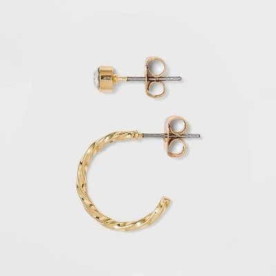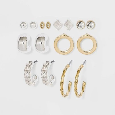 Add a perfect finish to your casual or formal looks alike with these Multi Studs and Chain Hoop Earrings from A New Dayâ„¢. This earring set includes a mix of silver- and gold-tone stud and hoop earrings that gives you plenty of styling options each day to coordinate with tons of outfits in your closet. Easy to secure with the postback closure, these silver and gold earrings are also nickel free to suit most skin types.
