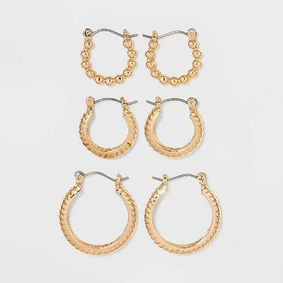 Update your jewelry box with the Gold Multi Textured Hoop Trio Earrings from A New Day™. This set of gold-tone hoop earrings adds shine and offers easy styling with any outfit. It includes three metal hoop earrings with different textures and designs in varying sizes to add chic variety to your jewelry collection. These lightweight earrings are comfortable for all-day wear — they have clip-in closures for a secure fit, while the nickel free metal construction suits most skin types. Wear them with black dresses and heels or with everyday tee and jeans combo.