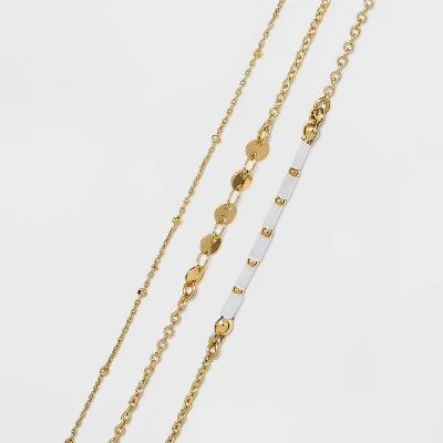 The Natural Beads and Discs Anklet Set from A New Day™ is sure to bring a pretty, golden glow to your summer look. This set includes three coordinating gold-tone anklets, one with natural tube beads, one with dainty discs and one simple satellite chain anklet. Wear each one solo or layer them together for a unique look that puts the perfect finishing touch on your warm weather outfits.