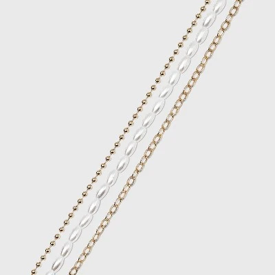 Finish your look with a bright touch when you wear the 3-Piece Pearl Anklet Set from A New Day™. This anklet set features three different designs — one classic gold-hue chain, one chic bead chain and one with pearl-like beads — so you can mix and match your styles depending on the outfit or occasion. Each piece features lobster claw clasp closure with an added bead detail to help provide a secure wear. Whether you sport these gold-hue anklets with flats or heels, they’re sure to brighten your day as well as your look.