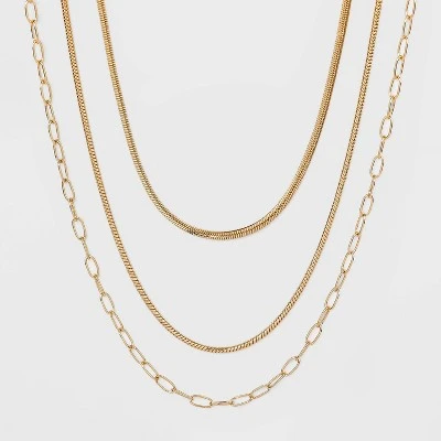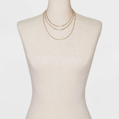Your jewelry box will get an effortlessly chic update from this Round Flat Snake Chain Necklace from A New Day™. It comes with an additional snake chain necklace and a simple, versatile chain link necklace. The flat design of the snake chains lends sleek, feminine flair you’ll love pairing with other gold-finished pieces. You can adorn the chain with charms for a touch of unique style, and the princess lengths of each necklace highlight your collarbone. Wear them all together for a layered look, or mix and match them for a range of original outfits. The lobster claw clasp provides you with a secure fit.