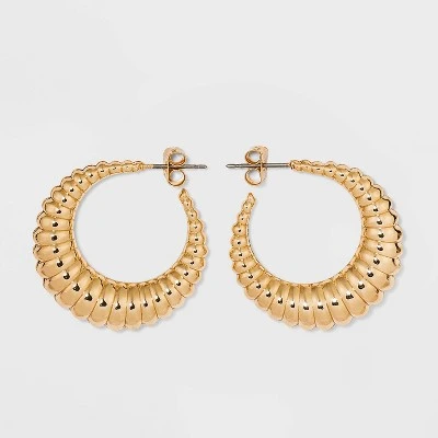 Glam up your chic evening look with the Gold Round Shrimp Hoop Earrings from A New Day™. These hoop earrings in a shiny gold tone finish make a versatile accessory for any occasion. They feature a textured round shape for an on-trend touch. The lightweight earrings are comfortable for all-day wear — they have butterfly backs for a secure fit, while the nickel free metal construction suits most skin types. Wear this pretty pair with black dresses and heels or with everyday casualwear for a sleek finishing touch.