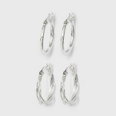 Pick up something that will never go out of fashion with the Braided and Polished Silver Plated Hoop Earring Set from A New Dayâ„¢. This set includes two pairs of simple hoop earrings in classic styles you’re sure to get plenty of wear out of. A pair of delicate hoops shine in a high-polish finish alongside a pair of braided hoop earrings that keep the minimalist style while adding a touch of depth to the look. These silver plated hoops are perfect for everything from sweats to swanky dresses thanks to their timeless look, and their click-down closures make them easy to wear for any occasion — even if it’s just sitting on the couch.