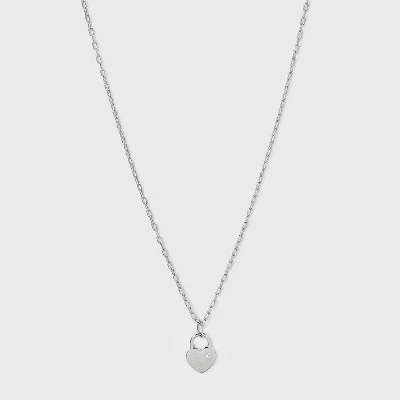 Bring some heart to your jewelry collection with the Silver Plated Padlock Heart Pendant Necklace from A New Dayâ„¢. Set on a princess-length cable chain with a silver plated finish, this dainty heart necklace is an ideal piece for everyday wear. Suspended at the center is a heart-shaped padlock charm set with a single, tiny glittering CZ, adding to the look just a touch of gentle shimmer. Accessorize a white tee and jeans, add a little personality to something more formal or give this heart padlock necklace as a thoughtful gift to show a little love.