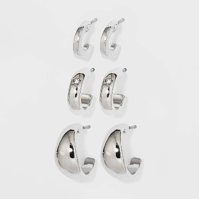 Brighten up your jewelry collection with the Small Hoop Trio Earrings from A New Dayâ„¢. Made with lightweight, nickel-free metal in a silver finish, these small hoop earrings come in different chunky designs — there’s a pair with flattened edges, a slightly thicker pair with flattened edges accented with a clear crystal, and a third pair in a bold dome-shaped silhouette. The small silhouette makes the earrings perfect to wear for any occasion and with any outfit. These earrings are secured by a butterfly-back post closure for easy wear. Pair any of these metal hoop earrings with your favorite outfits to dress up your everyday look.