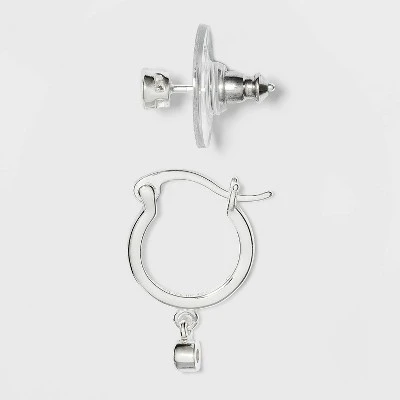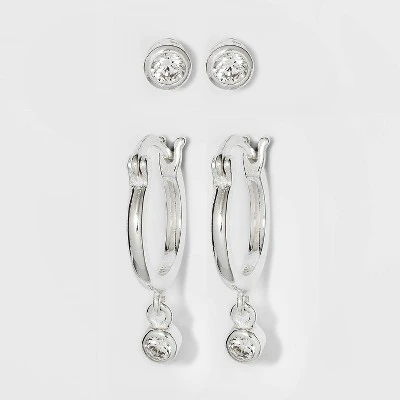 Keep it simple and chic with the Sterling Silver Cubic Zirconia Hoop Earring Set from A New Day™. This set includes two pairs of sterling silver earrings in classic styles you’re sure to get plenty of wear out of. A pair of round-cut CZs are set in simple bezel settings that let their light shine through, while the pair of dainty hoop earrings have small, dangling CZ charms for a subtle shimmer. Wear pairs separately for a simple, minimalist jewelry look, or easily coordinate two or more pairs together for a cohesive look with a good dose of sparkle.