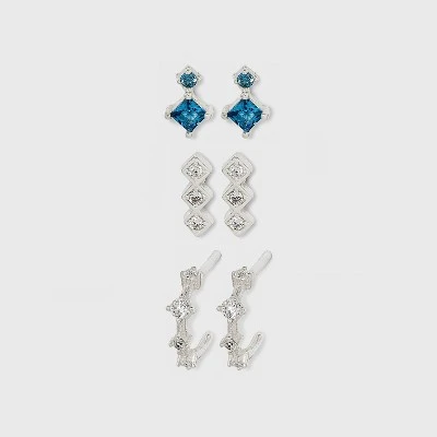 Glamorously accessorize your outfits for any occasion with this set of Three-Pair Set of Sterling Silver Triple Cubic Zirconia Stud and Hoop Earrings from A New Dayâ„¢. This three-pair set of sterling silver earrings includes one set of hoop earrings and two pairs of stud earrings for versatile styling. One comes with blue stones and two with silver zirconias for easy mixing and matching with your outfits. Nickel-free, this cubic zirconia earrings set suits all skin types, and closes with post back closures for a secure fit.