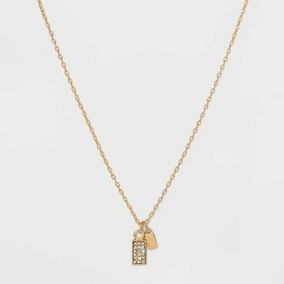 Add glam appeal to your ensembles by accessorizing with this Stone and Square Charm Necklace from A New Dayâ„¢. This gold-tone necklace features a square charm and a stone studded charm dangling from the linked chain to create a chic look you’ll love flaunting. Great to pair with both your casual or formal outfits, this pendant necklace makes a perfect gift for a loved one or addition to your own jewelry collection.