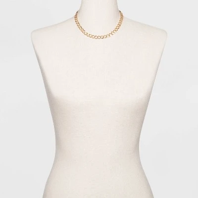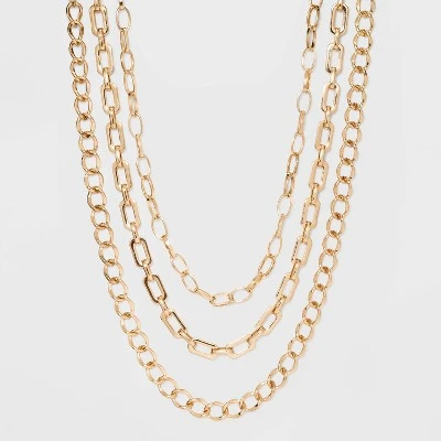 Elevate your look in one fell swoop with the Three-Piece Metal Chain Link Necklace from A New Dayâ„¢. The multi-strand necklace in gold tone is made of three individual strands of chunky chains in different styles to complete your outfit in statement style. It has a shorter, oval-link chain sitting on the inside of a longer rectangle-link chain, while the outermost chain is made of wavy round links. The three strands of this chunky chain necklace can also be worn separately for a little pared-down effect. Wear the multi-strand look with an evening turtleneck dress, and sport a single strand on your crewneck tee for easy daytime wear.