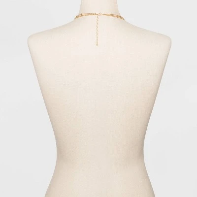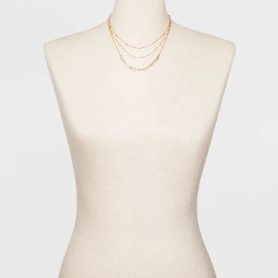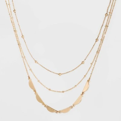Drape your neck in style with the Three-Row Layered Necklace from A New Dayâ„¢. Fashioned in elegant gold tone, this multilayered short necklace features three slender chains cascading downward, creating a mesmerizing appearance that you’ll love. The top beaded chain is accented with large beads spaced evenly along its entire length, the middle cable chain features golden beads at intervals, while the bottom layer has scalloped half-moon pendants at the center front. The layered chains fasten together at the center back with a lobster claw clasp, along with an extender chain for a conveniently adjustable fit.