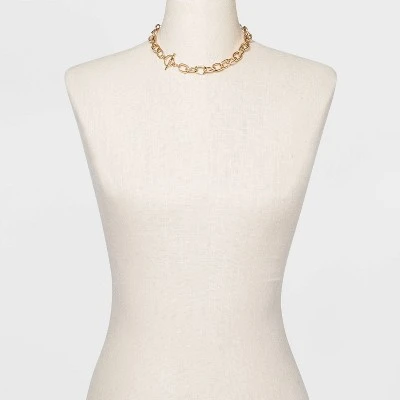 Keep it bold with the Toggle Chain Necklace from A New Dayâ„¢. A sleek toggle necklace is the perfect way to add some understated glam to your daily wear, and this one looks great on its own or layered with other chain necklaces for extra impact. Based around a large link chain for statement-making style, this faux-toggle necklace gives you toggle style with the ease of a lobster clasp closure along with an extender chain for an adjustable length. Sport it with black wide-leg trousers and a white blouse for a professional feel, or try it with jeans and combat boots for something a little edgier.