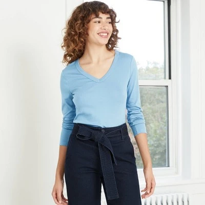 Add sleek style to your basic T-shirt collection with this Long-Sleeve V-Neck Fitted T-Shirt from A New Day™. This long-sleeve T-shirt in a solid color makes a go-to choice for easy pairing with a range of year-round casual outfits. It features a V-neckline and a fitted style to create a chic silhouette. The soft fabric with a hint of stretch offers both comfort and flexible movement. You can coordinate it with different bottoms or match with layering pieces to create a number of versatile styles.