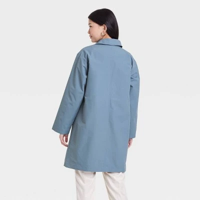 Bring comfort to drizzly days with this Rain Jacket from A New Day™. Made from water-resistant fabric, this rain jacket helps you stay dry, while the soft taffeta lining brings added comfort to your day. Falling at the knee for extra coverage, it features front snap buttons for easy layering over your outfits. Plus, the two side pockets offer you a spot to stash your small belongings. Tailored in a casual-fit silhouette and featuring a solid hue, this knee-length rain jacket features a collared neckline for a polished look.