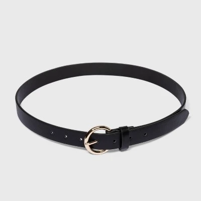 Bring classic style to your accessories collection with this Round Buckle Belt from A New Day™. This classic belt in a solid finish makes a go-to styling piece in your accessories collection. It features a golden buckle closure for a polished look, and the multiple hole adjustments offer a customized fit to make sure your bottoms stay securely in place. Pair with casual jeans or formal trousers to give a statement finish to your look.