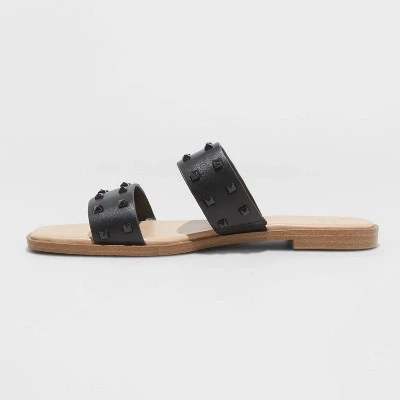 Keep your casual looks chic and stylish wearing these Stella Two Band Studded Sandals from A New Day™. These stylish slip-on sandals feature two bands with stud accents for a fashion-forward style you’ll love flaunting. The open-toe design provides an airy feel. In a solid color, these slide sandals pair well with your favorite dresses, jeans and more.